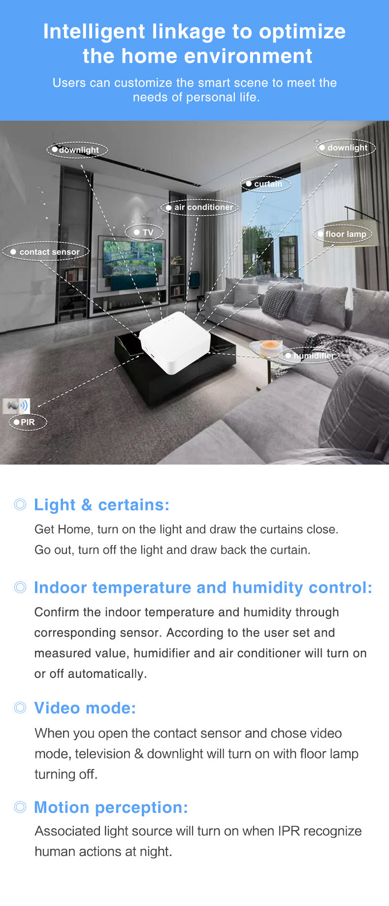 It consists of a highly integrated wireless WiFi module, a low-power wireless Zigbee and Bluetooth module and a motherboard. Through Tuya / Smart Life app, users can add devices, reset devices, third-party control and Zigbee/Bluetooth group control devices or appliances.